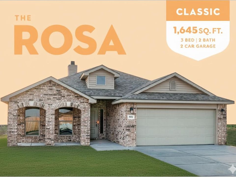 Buy NOW and get $10K use-it-your-way cash!! Our Rosa floor plan boasts an affordable and spacious option for new home buyers in West Texas. The Jade floor plan features: Brick exterior with stone accents and a covered entryway, Luxury vinyl plank flooring in the home's common areas, Open-concept kitchen, living, and dining areaGranite or quartz countertops throughout, Spacious kitchen island with bar seating, Stainless steel appliances, Enclosed pantry, Corner brick fireplace, Premium plumbing and lighting fixtures, Secluded master suite with walk-in closet, drop-in tub, and walk-in shower and a covered back patio.