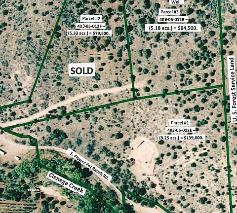 CB# 12659 - Wonderful Wilderness property with beautiful views. Priced to sell. OWC terms available. 9.25 acres with beautiful building site. Adjacent to U.S. Forest Service Land and it has Cienega Creek Frontage. Fronts on S. Flower Pot Ranch Rd. Access for hiking and riding on Gov. Land.