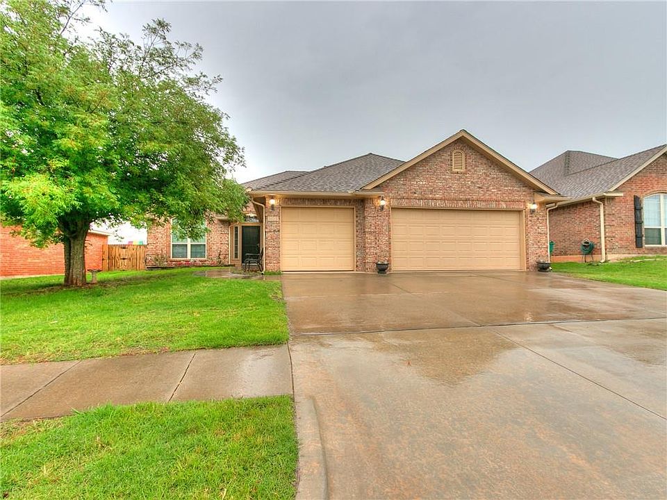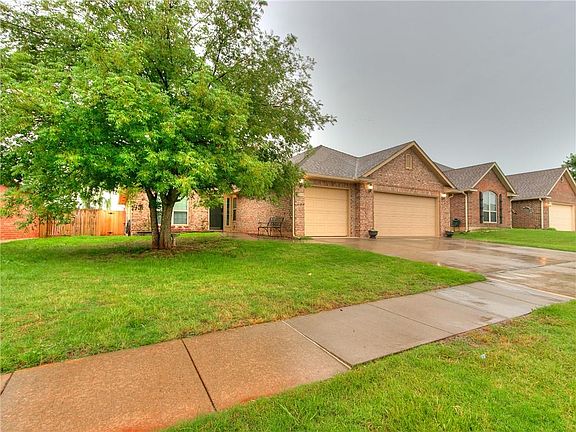 This jewel, only 15 minutes to Tinker AFB, 15 minutes to downtown OKC and 20 minutes to Norman, is calling your name. Very well kept 3 BR, 2 bath, study and 3 car garage has brand new (May 2023) wood-look flooring throughout and a 2 year old HVAC. Great neighborhood on low traffic cul-de-sac with alarm system installed, blinds throughout, sprinkler system, extended garage with in ground storm shelter. An added bonus--washer, dryer and refrigerator stay with the home. Call me today for a private showing.