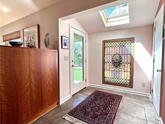 Built in 1963 but reimagined by the current owners in the mid-2000's, this incredible four-level split is situated on 3.16 acres offering beautiful views from every angle. Set back from the road for maximum privacy, the exterior boasts an expansive lawn, mature trees, beautiful landscape, outbuildings, and a peaceful backyard garden filled with pathways and perennials. Inside, the open concept floorplan offers spaces equally ideal for day-to-day living as well as large scale entertaining. With soaring ceilings, walls of windows, skylights and custom details, the main level provides a great room, dining area, chef's kitchen and wonderful sun room with woodburning stove. Go up a few steps to find two guest bedrooms, guest bath, and the spacious primary bedroom with en suite bathroom and ample closet space. The lower level is another expansive area currently housing an office, sewing room, laundry and storage. It would also make a great rec room, game room, craft room, exercise space...or