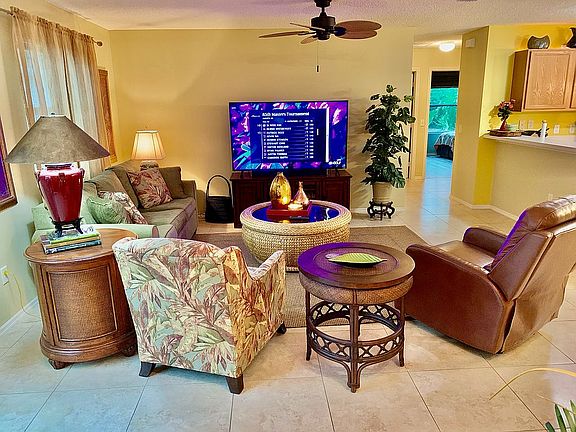 TURNKEY Colony Patio Villa with gas golf cart being sold by owner in the VILLAGE OF BELVEDERE, one of the most CENTRAL LOCATIONS in the Villages! YOU’RE HOME or ready to rent in this totally furnished, equipped 2 BR/2 Ba/1.5 car garage Patio Villa that has been UPDATED, KEPT CLEAN, no pets or smoking, and is move in ready! Located on quiet Ascot Loop on the back street of HIALEAH VILLAS very near CR 466 which is in the heart of the Villages with all of the everyday conveniences you could ever need within a 5 minute golf cart ride – shopping, PO box, dining, entertainment, banking, medical care, churches, and the Villages library! Enjoy the many entertainment opportunities like complimentary golf year round, FREE NIGHTLY ENTERTAINMENT at Lake Sumter Landing which is only 10 minutes from the villa, swimming, pickle ball, tennis, indoor games and clubs are just to mention a few within a short walk, golf cart or car ride away. The unmatched VILLAGES LIFESTYLE is easily accessible at the Laurel Manor Regional Rec Center, 3 Village Rec Centers w/ family pools - Pimlico, Churchill Downs, & Bridgeport, and 7 Neighborhood Rec Centers w/ adult pools - Lynnhaven, Belvedere, Tall Trees, and Bonnybrook. This villa has been tastefully decorated with new LR furniture in 2018 with a common color pallet of apricots and greens from the screened porch’s new furniture to the rugs and spreads in the bedrooms. Has 65” Ultra HD LED TV & Blu-Ray DVD, 32” TV in master, with Wireless WIFI internet throughout. Ceiling fans in living and bedrooms. New HVAC in 2016, new ridge vent of roof in 2018, new vinyl plank flooring in 2020 in bedrooms with 18”X18” tile in remainder of villa. New dishwasher, garbage disposal, microwave and springs on garage door in 2021. Attractive and easy to maintain landscaping of a queen palm, holly, hibiscus, ginger, cardboard palm sago, alamanda, and Hawaiian ti. Woven wood shades over mini blinds in bedrooms allow you to sleep in or adjust to the brightness you prefer. The open eat-in KITCHEN features MAPLE WOOD CABINETS, a GAS STOVE, with a BREAKFAST BAR and several lighting options. As you walk down the hallway leading to the two bedrooms, you will find a very colorful & delightful GUEST BATHROOM with a large vanity and a TUB/SHOWER combo. The GUEST BR has a CEILING FAN, a large window for natural light, large closet and TWIN BEDS. The spacious MASTER BR has black furniture with a KING SIZE BED, fan, large window and large walk in closet. The ENSUITE MASTER BATHROOM has a single vanity and a WALK-IN SHOWER with rain shower head. The villa is very quiet with tall hedge at the back to buffer sound. This villa is move in ready with everything you need and has an excellent rental record. LOW MAINTENANCE villa with a LOW BOND balance of $3,106.36! Call 850- 596-2486 or 7 today to schedule your private live or virtual showing! You will not be disappointed!!