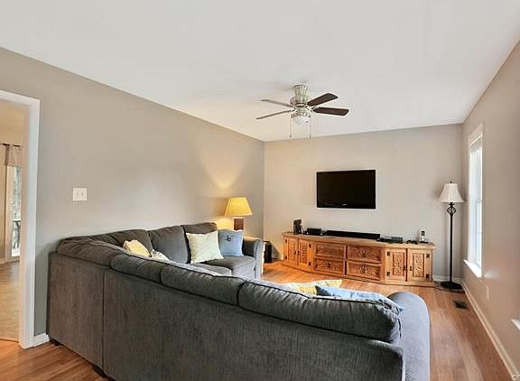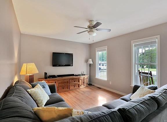 Modified Cape Cod House with a full height crawl space (potential for finishing a basement or storage space). The upstairs has two large bedrooms, a large bathroom, a full-size laundry room/closet, and walk-in linen closet. The downstairs has two smaller bedrooms (smallest is 9.5ft by 11.5ft), bathroom, kitchen and living room. A lot of work has been put into this home. New flooring was installed in the entire house in 2018. A new central A/C and heat pump was installed in June 2020. The trees surrounding the house and overhanging the street were all trimmed in July 2020. The lot offers a small low maintenance front yard with a shed, a two-car asphalt driveway, street parking for three vehicles, a large fenced-in (sloped) back yard with many trees and brush that requires annual trimming, pruning, and raking, and a greenway with a stream and wetlands flowing to Falling Creek on the adjacent properties. The neighborhood is adjacent to Genito Road and the sounds of the racecars at the Southside Speedway can be heard on the property (but not in the house) in the afternoons during the Spring and Summer months. This neighborhood is not part of a Home Owner's Association and thus HOA fees do not apply to this property.