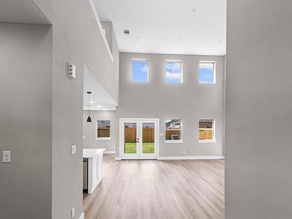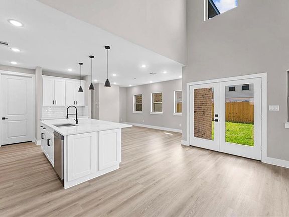 The impressive living area features soaring double-height ceilings that fill the home with natural light and create an inviting, open atmosphere. The contemporary kitchen includes a stylish island, ample counter space, and seamless flow into the dining and living areas—perfect for entertaining or family gatherings. The primary suite is conveniently located on the first floor, offering a private retreat with a spa-inspired bath, dual vanities, and a spacious walk-in closet.