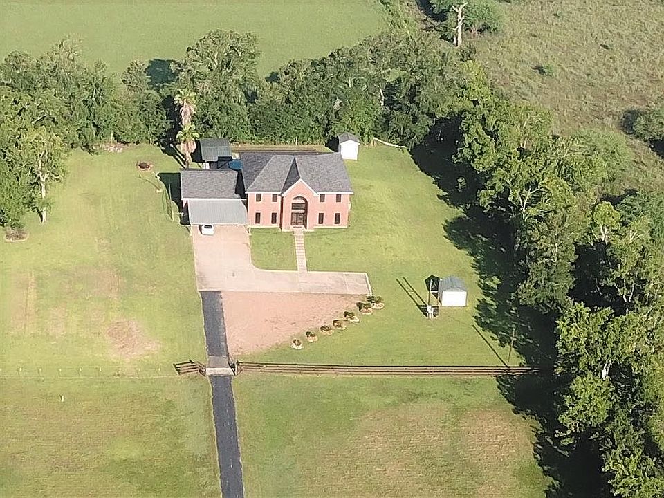 Beautiful spacious home on 10.5 acres. No HOA. Home is elevated and has never flooded. Property has two large workshops, livestock corral, covered RV parking, pond, and three wells. Back yard has large pool with covered BBQ area and fire pit. Large master bedroom upstairs with walk-in shower and closets. Game room and two other bedrooms upstairs. Kitchen has granite countertops, island stove, dual ovens. living area, dinning room, and office downstairs. Entry way has roll down hurricane door with hurricane screens on the windows. Generac standby generator.