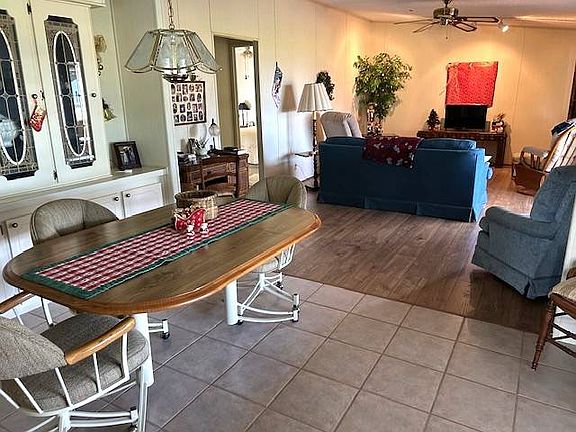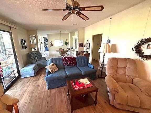 This charming 2 bedroom, 2 bathroom home sits directly on the 18th hole with stunning golf course views and is conveniently located right across the street from the clubhouse. Offering 1,100 sq ft of living space plus a 10' x 15' windowed lanai, this home provides the perfect blend of comfort and Florida lifestyle living. Enjoy peace of mind with a 6-year-old metal roof, newer vinyl siding, and a 2-year-old washer. The home comes fully furnished and includes a golf cart (needs batteries), making it move-in ready and ideal for full-time or seasonal living. Additional features include a large golf cart shed, plenty of storage, and placement in a desirable 55+ community known for its amenities and friendly atmosphere. Don't miss this incredible opportunity to own a home with unbeatable views and an unbeatable location!