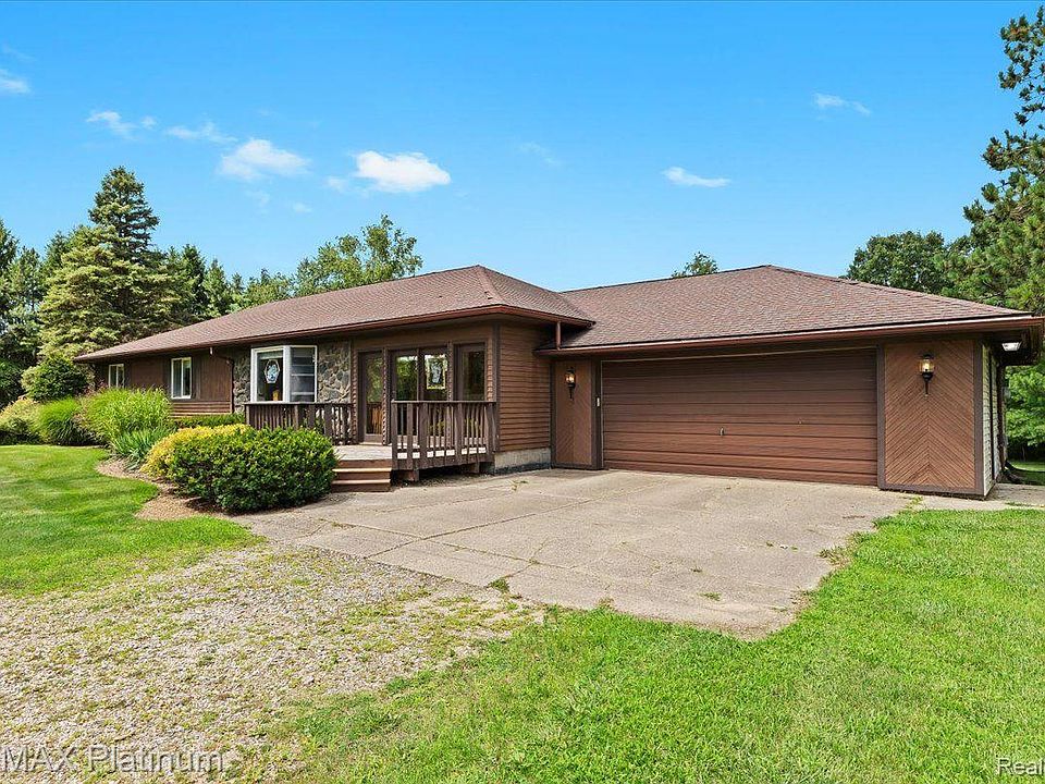 Welcome to your next Home Sweet Home, 2606 Sexton Road, Howell, MI. This sprawling almost 2200 sf, 4 bed, 2 1/2 bath Ranch Beauty will not disappoint! From the moment you walk in, you will be impressed with all of the unique qualities of this adobe including the radiant stained glass windows in kitchen/foyer, the jaw dropping custom made woodwork throughout including the beautiful kitchen cabinetry made from the CHURCH PEWS of St. Cyril Church in Taylor, MI, the extra large bedrooms including the very private primary suite with its own sitting area/entrance to the massive deck with the bonus of an 8+ person SAUNA, the rolling hills of the one plus acre parcel and finally the additional detached, 4 car HEATED 24X40 garage/220 Volt. Other notables include one year home warranty included in sale, Anderson windows, ceiling fans in most rooms, pullout drawers in kitchen including trash, newer boiler 2014, newer well pump 2014, septic tank cleaned 7/2024. Microwave NOT INCLUDED in sale. Come Fall in Love!