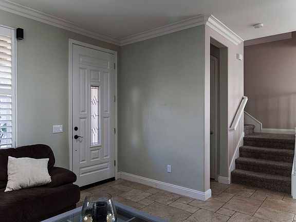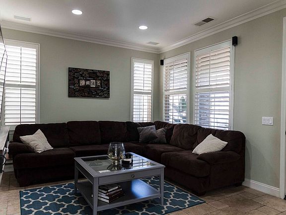 Fantastic ready to move-in turnkey 4 bedroom 2.5 bath view home in desirable gated community located on a private cul-de-sac. Light and bright, open and spacious, this sensational home has custom tile flooring and crown molding throughout the downstairs. Kitchen has tons of counter space with granite counter tops, breakfast bar and stainless steel appliances. Recessed lighting, fireplace, and one of a kind plantation shutters are on the windows and doors along with tile mosaics that make this home extra special. Upstairs has 4 incredible bedrooms with distressed hardwood floors throughout. This home also has an upstairs laundry area, Jack and Jill connected bathroom and a large master suite with huge walk-in closet. The master also boasts a private balcony that overlooks the mountains and park and play area in this private gated community. Rear yard is meticulously maintained with wrap around grass area and covered patio area. Two car side by side garage has custom painted flooring too. This home is a rare find with NO MELLO ROOS, LOW HOA fees and is conveniently located in a wonderful gated community walking distance to the private park, play area and close to schools, frwy access and so much more. Come see this amazing home.