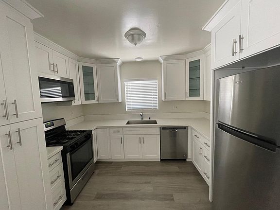 Beautifully remodeled 3 Bedroom + 2 Bathroom ground-floor apartment. New paint, new laminate floors throughout, new kitchen cabinets, engineered-stone countertops and stainless-steel appliances. Includes stove/oven, dishwasher, microwave and refrigerator. Large Living Room and separate Dining area, with bright natural light. Fans throughout the home. There is a large Master Suite with private Bathroom, and two more Bedrooms with a shared Bathroom. The Bedrooms have mirrored closet doors and blinds. This is a four-unit building with plenty of parking and a spacious sun-deck at the back. This unit comes with 2 private enclosed detached garage spaces for this unit. This building also has onsite Laundry machines. 2 garage parking. Renter covers utilities. No smoking. No pets.
