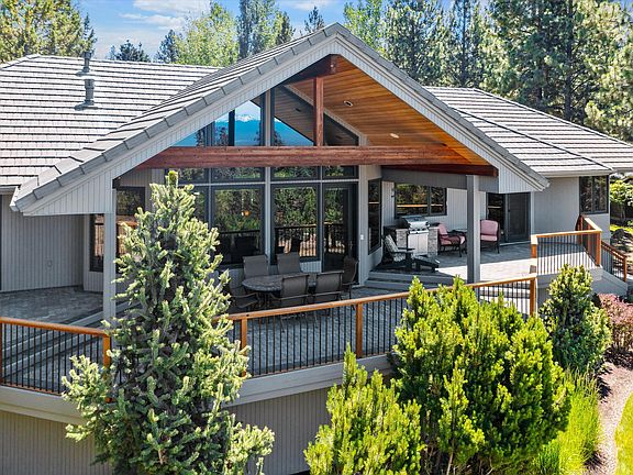 Enveloped by the stunning Three Sisters, entering this single level residence you immediately know you belong. The peaks are visible from almost every room. Extensive quality woodwork throughout including wood wrapped, metal clad windows, solid core doors, custom builtins. Thoughtfully designed open concept floor plan w/ primary suite separation. Granite counters, temperature controlled wine area, large island, coffered ceiling & deck access, this kitchen has space for it all! A great room w/ incredibly mastered vaulted ceiling is ideal for entertaining or sitting by the fire & gazing at the peaks. Primary suite affords two large walk-in closets, marble bathroom, deck access & of course the incredible view. Designated office is complete w/ extensive built-ins. Dining room opens to front patio-the ideal spot for enjoying coffee while watching the sunrise. Three car garage is a car lover's dream complete w/ natural light, outdoor access & flat driveway. Abundant storage.