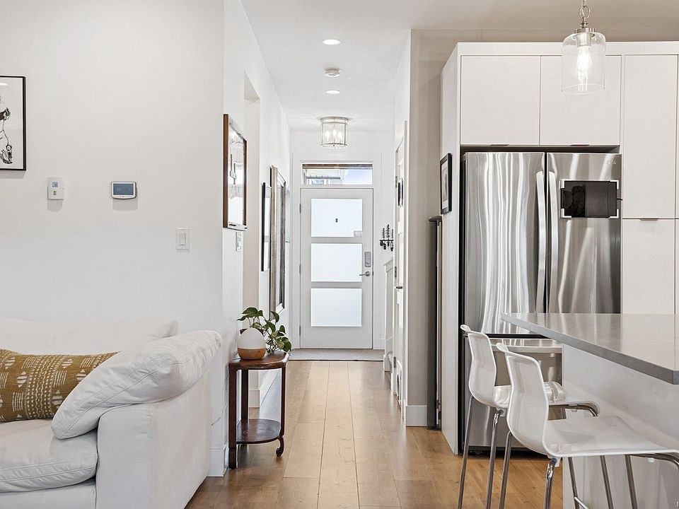 Elevated ceilingsLarge windowsOpen-concept main floorModern kitchenQuartz countersStainless steel appliancesGas fireplace