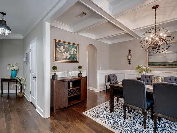 All bedrooms are upstairs, providing privacy and ease for family living. The main level features an open floor plan with hardwood floors in the foyer, kitchen, and dining areas, complemented by elegant crown molding for a touch of sophistication.
