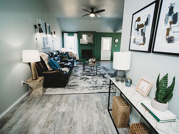 Stylish lightingCharming brick fireplaceUpdated fixturesHigh ceilingsPlush carpetingRich laminate wood flooringLarge windows