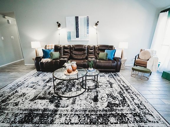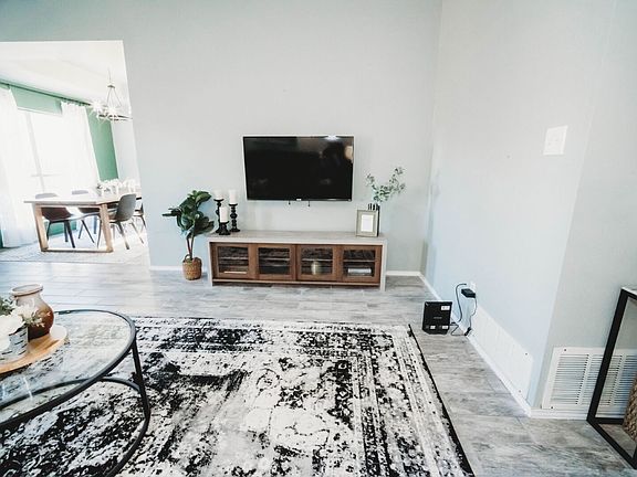 Discover this inviting 3-bedroom, 2-bath home nestled in the well-established Copper Mountain subdivision. Step inside to a welcoming living room showcasing rich laminate wood flooring, soaring ceilings, and a charming brick fireplace. The adjacent dining area is filled with natural light from a large picture window and is accented by a deep tray ceiling and stylish lighting.