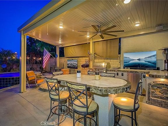 Rare Sterling Heights pool home that resides on the community perimeter allowing for privacy and views as well as gentle breezes. This home was recently remodeled with a stunning kitchen including all new cabinetry, quartz counter tops, full wall glass tile backsplash and stainless appliances. Don’t miss the high-tech refrigerator. All three bathrooms were also remodeled with new cabinets, counters, sinks and toilets. The primary bath has double vanities and a stunning shower. Plantation shutters accent the glass sliding doors to the exterior. The living room features vaulted ceilings and a refreshed smooth concrete modern fireplace. Enjoy true California living in your beautiful rear yard. The pool was installed about 9 years ago and features flagstone coping, pebble tech surface and a built-in hot tub. The pool is gas heated but also has a rooftop solar heating option. Entertain in your covered outdoor kitchen with BBQ, refrigerator, and island seating for 6. This area is wired for TV, LED lighting and speakers. You’ll enjoy the sit-down firepit as well. Even though you have central air, nearly every room, and the outdoor kitchen, have ceiling fans. Don’t let this one get away!