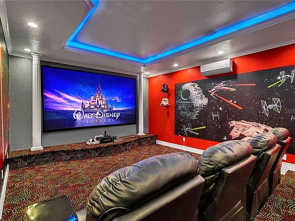 This complete resort-feel home features two master suites with bathrooms on the main floor, an additional bedroom with an en suite bathroom, and 2 themed kids' rooms upstairs. It has a very functional and comfortable living space and a very well-appointed kitchen. There's tile flooring in the living room, dining room, and family room as well as in all wet areas. The oversized 2-car garage has been converted into a state-of-the-art game room and movie theater with a 130-inch screen and 7.1 surround sound speakers for tons of enjoyment. The movie theater even has electric reclining theater seats with its own separate air conditioner for those hot days.