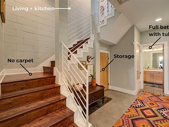 **Photos were taken while a previous occupant was in the home. Furnishings / decor are different than what is shown in listing photos.** This is your chance to snag a large two-bedroom condo on a very hip stretch of East 6th. The location is incredible. Step outside and walk to some of East Austin's best spots, including lounges and coffee shops, an H-E-B, Plaza Saltillo, and the CapMetro Rail. Downtown Austin is just a five-minute bike or scooter ride away. Just outside the front door, you'll find a fenced private patio for morning coffee or evening cocktails, an attached one-car garage with additional driveway parking, and a flexible floor plan with an open-concept second-floor living and kitchen area. The full-floor primary suite features an updated walk-in shower, and the second bedroom works perfectly as a guest room or work-from-home office. Thoughtful construction with shared walls made of concrete masonry units (CMU) provides extra sound insulation and peace of mind. Modern updates, such as new kitchen countertops and bathroom tiling (both done in 2022), complete the package. This is East Austin living at its finest. Modern, versatile, and perfectly connected.