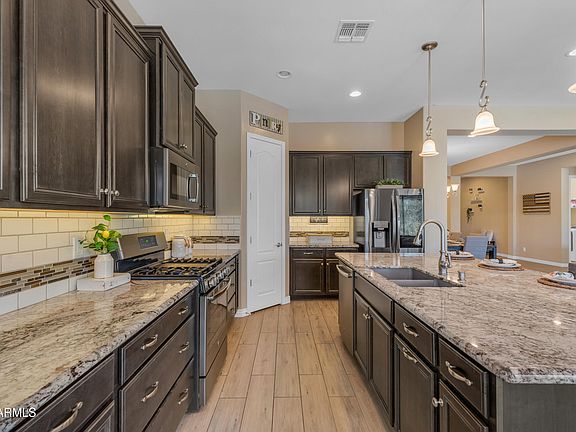 Welcome to this inviting 4-bedroom, 3-bath single-level home in the sought-after community of Adora Trails in Gilbert! This property combines comfort and practicality with a layout designed for easy living. As you step inside, you'll find a spacious den perfect for an office or flex space. The heart of the home features a beautifully appointed kitchen with granite countertops, a gas stove, and wood-look tile floors that add warmth and style.
