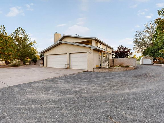 Welcome to a custom home on acreage in Albuquerque's iconic South Valley ~ tucked on a peaceful cul-de-sac with views + a true sanctuary feel. Light-filled great room w/ vaulted ceilings + wood stove. Updated kitchen w/ large island + tons of storage. Four bedrooms, multiple living areas + great separation of space. Upstairs loft has two flex spaces that open to a balcony -- perfect for coffee + quiet moments. Detached studio/outbuilding w/ electricity + mini split (not counted in sq ft) ideal for office, gym, art or hobby space. Outdoor living front + back + room for gardening, animals, toys, RV/boat.