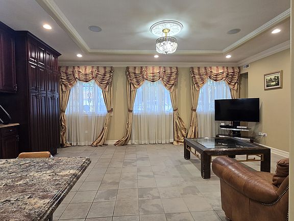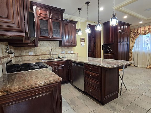 Better than a condo, this stunning home offers a chef's kitchen with cherry cabinets, granite countertops, stainless steel appliances, and a Viking stove. The spacious living room features large windows and custom-built storage, creating a warm and functional space.