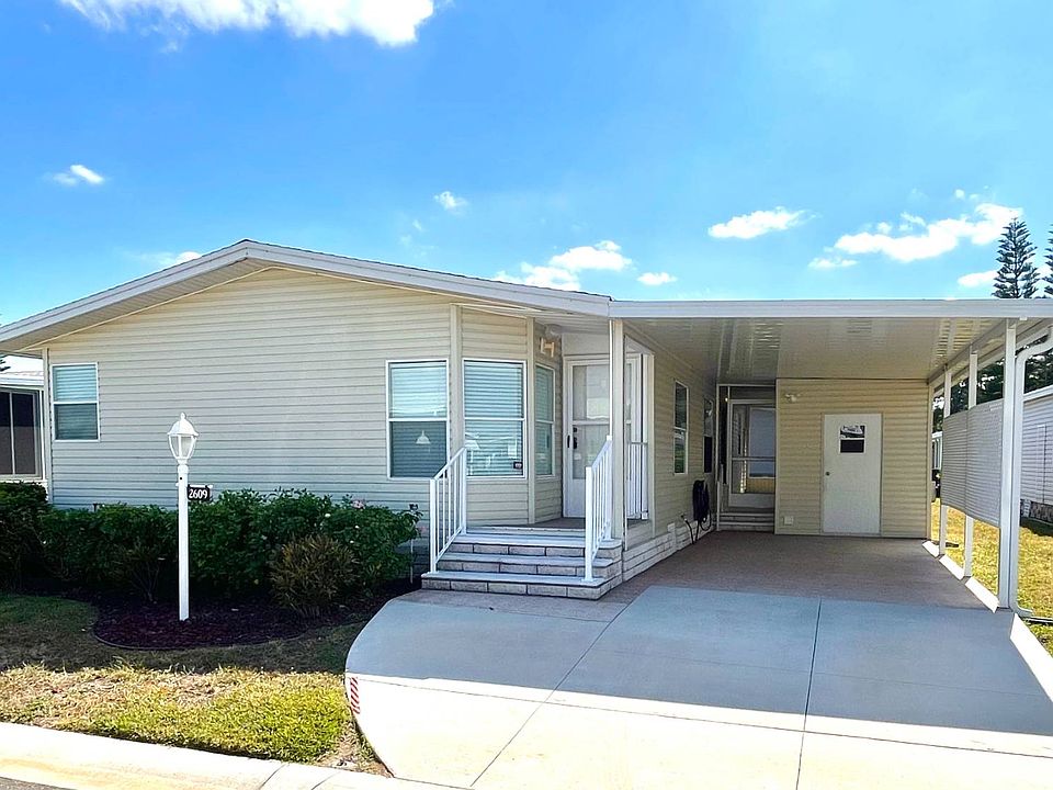 NEW TO THE MARKET! Classic 2BD, 2BA CHANDLER CUSTOM HOME in Sun Key Village, Palmetto Florida's Premier 55+community! NEW ROOF 2025! This lovely 2BD, 2BA home is your chance to own your own Florida escape or start your full time retirement dream! Vaulted ceilings greet you upon entry! You'll love the spacious living room overlooking the formal dining area thatfeatures a built-in hutch to display your favorite china and store hosting supplies. The large wrap around kitchen with plentiful cabinetry & counter space, is the perfect place to prepare your favorite meals for family and friends. A bay window nook just off the kitchen provides the ideal space for casual dining or a separate sitting area. Down the hall, you'll find a separate entry to the home with dedicated built-in desk/ office area and more cabinetry and storage. The guest bathroom w/ tub shower combo, and large guest bedroom, will help your guests feel right at home! The spacious primary bedroom, features a mirrored double door full length wall closet, and French door entry to the master ensuite with walk-in shower. Enjoy the soft Florida evening breeze or daytime, sunshine in your large, screened in lanai! There's plenty of room in the carport for multiple vehicle parking and a large shed for extra storage. Additional pluses for this home is the brand new plumbing throughout, and the 3 yrs young Water Heater! Lot rent $1411.75 and covers all amenities, taxes, and a Spectrum Premium Cable/Wi-Fi package! SUN KEY VILLAGE is a THRIVING, Pet Friendly, PREMIER, GATED 55+ Community in Palmetto FL, w/resort quality amenities, including, Heated Swimming Pool, Whirlpool Spa, 6,000 sq. ft. Community Clubhouse, Fishing On-Site, Shuffleboard, Pet Friendly (under 20 lbs), Professional, on-site management, Pond w/Fountain, Micro Golf Course, Pickleball, Billiards Room, Library, Fitness Room, Tiki Huts/Outdoor Kitchens, Security Cameras on Property, Upgraded Electric Privacy Gate at Front Entrance, Fire Pit, Outdoor TVs, Corn Hole, Covered Patio Area for Entertaining, and the spacious clubhouse hosts an array of activities including: dinners, social clubs, cards, bingo, billiards, dancing and seasonal celebrations! Sun Key Village is locatedclose to all the Gulf Coast has to offer including Tampa/Saint Pete, Anna Maria Island,Sarasota, andthe world class crystal white sand beaches of Siesta Key! All listing information is deemed reliable but not guaranteed and should be independently verified through personal inspection by appropriate professionals. Integrity Mobile Home Sales cannot guarantee or warrant the accuracy of this information, measurements, or condition of any property. Measurements are approximate. Lot rent is subject to change!
