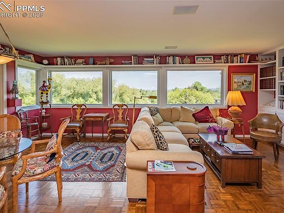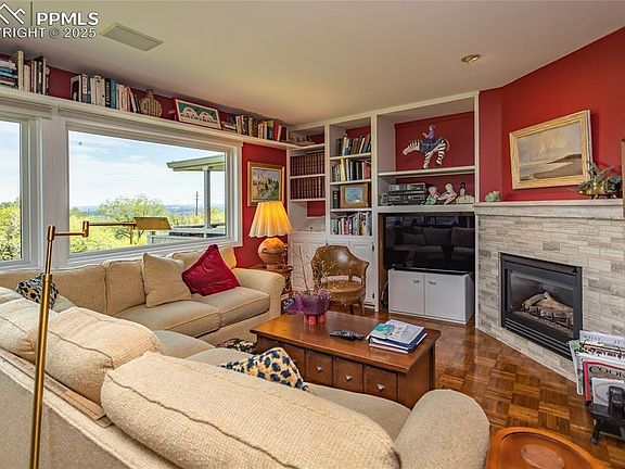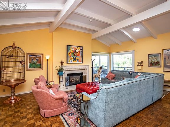 Welcome home to the Prestigious and maintenance-free community of Spring Grove. This home represents a rare opportunity as it sits on the north rim of the complex and offers fabulous views of the mountains and city. The property also backs to an open space where nothing else can be built. As you enter the home you are met with a tile entry and parquet floors throughout. The main floor boasts vaulted and beamed ceilings and a gas fireplace in the spacious living room. Also on this floor is the library/TV room with ample bookcases, another gas fireplace, and three large picture windows affording a beautiful view to the north, a dining room, and lovely remodeled kitchen. This floor offfers three accesses to the patio with beaitiful gardens and a Boulder Pond water feature which runs all year in winter and a covered and protected seating area with skylights, perfect for conversation and dining daytime or after dark. The large master bedroom on the lower level has a wonderful gas fireplace with a remote control that can be conveniently set to your favorite temperature. Also included are an ensuite bathroom, Jacuzzi tub, steam shower, and a walk-out to a covered flagstone patio. The guest bedroom is also located on the lower level. There is an expansive 42’ x 22’ wood deck creating the perfect atmosphere for dining and entertaining. Custom built-ins that provide elegance and functionality including a spacious two-car, heated garage that offers plenty of built-in storage cabinets and closets. Other features include central air. Situated in an unbeatable Broadmoor location, residents enjoy security and privacy with easy access to local amenities, shopping, dining, and community walking trails that connect the neighborhood together. This wonderful home is in excellent condition and shows refined craftsmanship with modern effects. Come take a look. Don't miss out on this property.