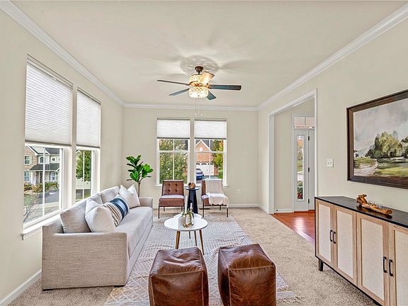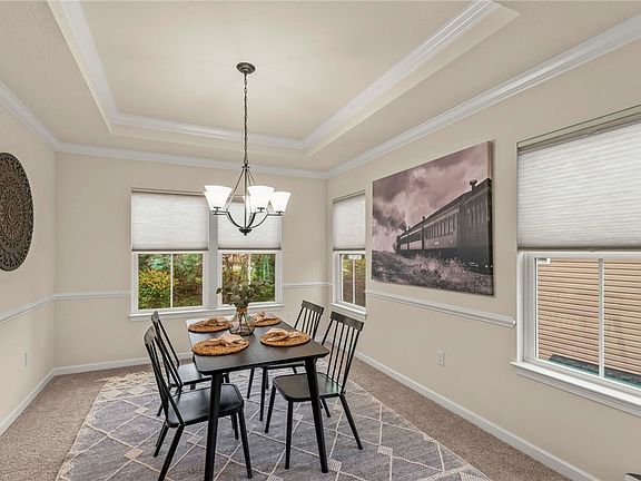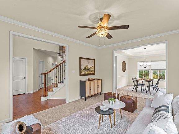 Delight in a vibrant array of perennials that greet you at a charming under-roof entryway atop the porch! As you step inside, a soaring two-story foyer reveals a custom multi-directional staircase. This home is move-in ready, featuring fresh paint and new carpet alongside a fully equipped laundry with elegant cabinetry. A discreet den off the family room provides a serene workspace for remote productivity. Transition through the vaulted breakfast nook to discover a secluded deck with a retractable awning. For formal gatherings, the tray ceiling in the dining room sets an inviting tone. The primary suite boasts two walk-in closets and dual sinks for ultimate convenience. Every bedroom is enhanced with custom closet organizers. The lower level features a sophisticated full bath and an adaptable layout, perfect for an Au Pair suite or a theater-billiards room—professionally finished and awaiting your personal touch!