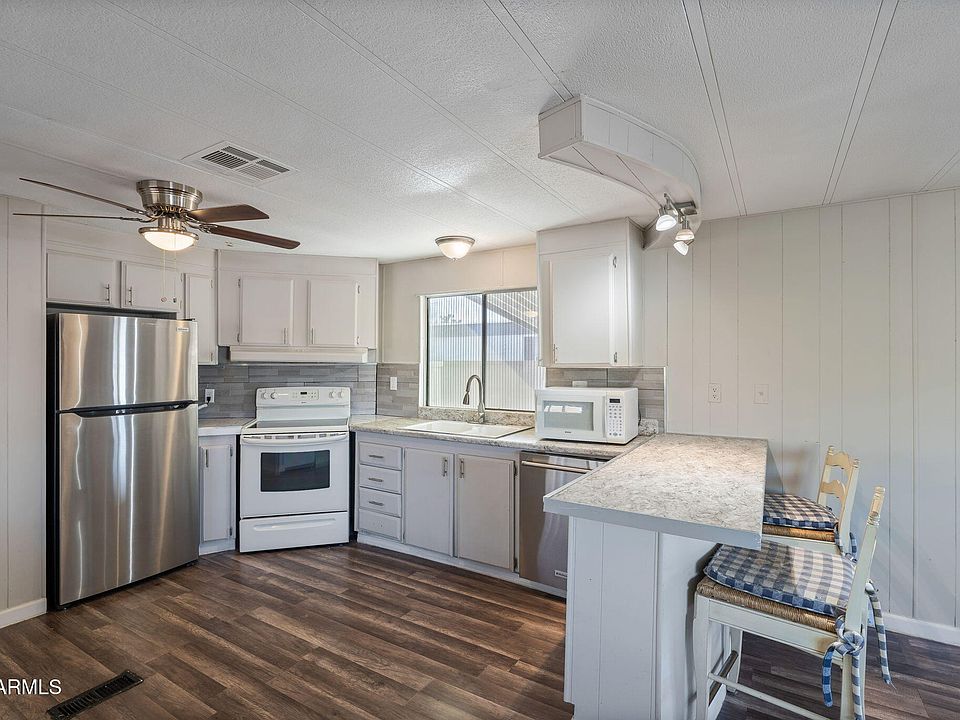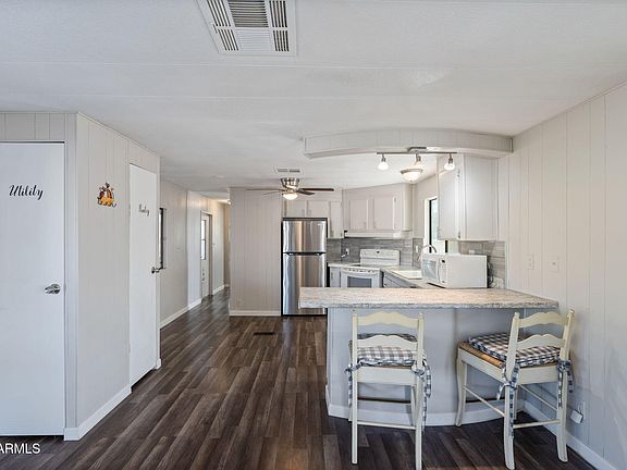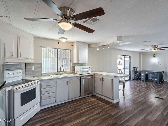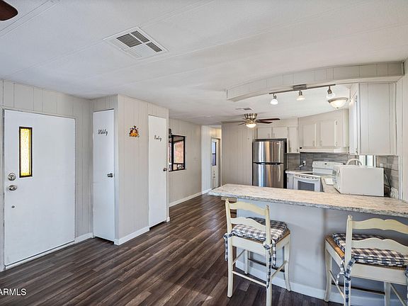 55+ Community! This property has nice open floor plan. Has newer stainless steel refrigerator and dishwasher and white stove. Island in the kitchen which has sitting for 2. Good cabinet space with a pantry. Laminate flooring throughout the home. Ceiling fans in all the rooms. Master bedroom has walk in closet space with built in dresser and a desk. Master suite in the bedroom and as well with a walk in shower and vanity. The guest bedroom is split on other side of home which gives guest there space. Good closet space and built in dresser and bathroom is near bedroom for easy access. Enclosed patio are which is great to have your morning coffee or entertaining. Washer and dryer are inside!  Has nice shed for extra storage. Contempo is pet friendly and will allow fencing with hoa Approval!