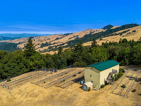 Breathtaking sunset views await on this 33± acre homestead retreat just east of Garberville. The property features a charming 1 bed / 1 bath home with open floor plan (approx. 900 sq. ft.) and an additional finished 900 sq. ft. garage/shop. A redwood deck with hot tub wiring extends the living space, while a solar-powered automatic gate welcomes you in. Water is abundant with a spring, well, 120,000 gallons in poly tanks, plus a 40,000-gallon AG tank (liner needed). Off-grid but fully wired throughout, the land includes 12 large steel-frame greenhouses with soil and electrical, a massive lower shop, and several yurt decks, ideal for hosting, hip-camp, or guest spaces. Gently rolling acreage offers room for animals, gardens, and sustainable living.