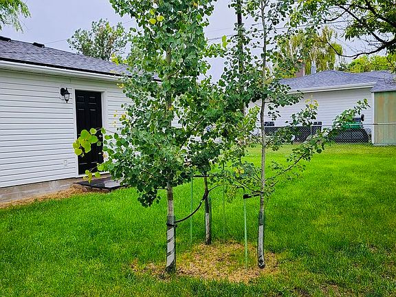 Large corner lotCovered redwood back patioPatio areasSliding doorsBrick walkwaysLandscaping with mature treesReal hardwood