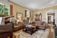 Gas fireplaceMature treesManicured gardensIn-ground heated poolHardwood floorsBuilt-in library shelvesCorner lot