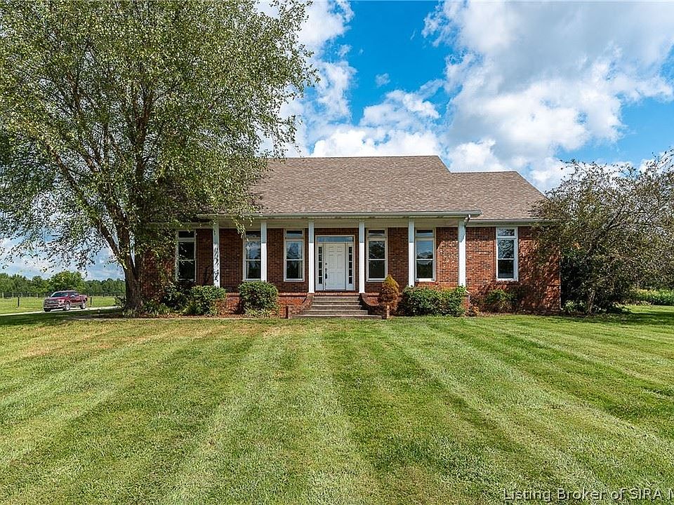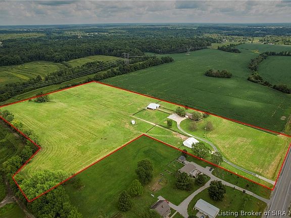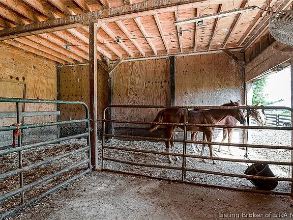 17 Acre Horse Farm features divided pastures with great fence. Just 2.5 easy miles off exit 34, this farm is located 40 easy minutes to Louisville and 30 minutes to Madison (just minutes to Hardy Lake). The home is 1920's era, but built in 1998... 9âEUR(tm) ceilings... extensive finger jointed wide trim and wonderful crown molding. The Large Kitchen has an amazing amount of extra tall cabinets ... the windows in the kitchen eating area are arched brick adding to the 1920âEUR(tm)s feel.. most windows in the home have transoms and are expansive. The farm consists of front acreage for hay, a 45 x 40 pole barn with (2) 12âEUR(tm) doors and concrete floors, a storage closet, electric, water just outside of the barn and a door for horse access. The back barn is 40' x 50' with 6 large stalls (stalls will accommodate large or small horses), both sides have 10âEUR(tm) overhangs, water & electric. There is a 60'x60' parking/turn around area for trucks and trailers. The driveway is paved and the home sets beautifully on the property. This home is ready to move into for both 2 and 4 legged beings and with very little effort would be a showplace!