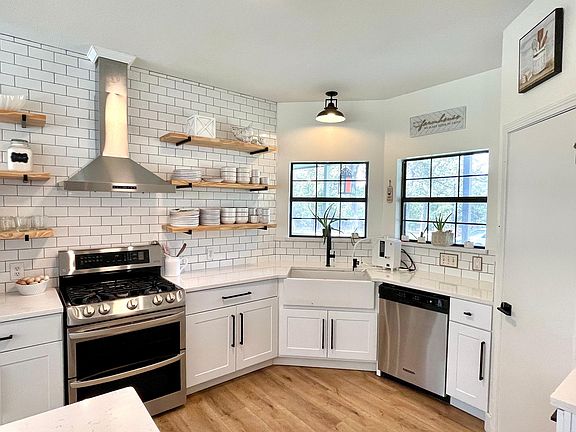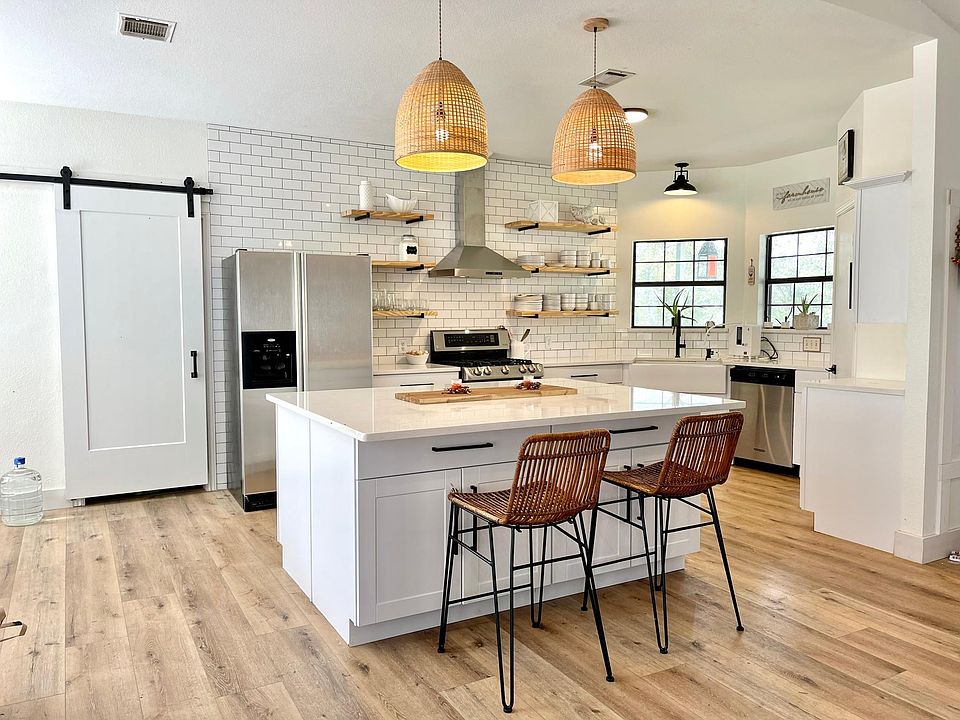 Freshly Remodeled Farmhouse-style house on 5 acres surrounded by trees & pasture with electric gate & fully fenced.
