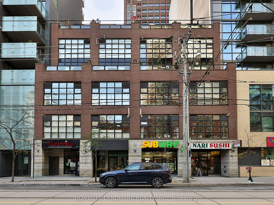 Absolutely stunning Abbey Lane Lofts. This Exquisite 6-Storey Re-Creation Of a Turn Of The Century Warehouse. One-bedroom Loft featuring 998 sq ft of living space plus a rare 250 sq ft Private terrace With Gazebo, gas BBQ line & hose bib water lines. Enjoy soaring 11 ft ceilings, Exposed duct work, warehouse-style windows, open-concept living perfect for entertaining, a spacious dining area, and room for a home office. The raised bedroom with sliding barn doors adds character, and the bathroom and floor tiles were renovated in the Fall of 2023 by Laird Kitchen & Bath. Upgraded dropped track lighting throughout. 1 Underground parking & 1 Locker included. Locker is conveniently located near the Loft. Located in the vibrant King East community with the King streetcar at your door and steps to shops, cafés, and restaurants. A must-see loft! ** Watch Video Virtual Tour**
