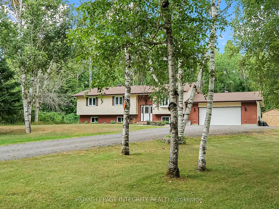 Superbly maintained & tastefully updated, this 3+1 Bed, 2 full Bath raised bungalow is a true escape from city life, yet less than 30 minutes to Kanata. Set on 1.5 acres of serene woodland, this property is a nature lover's dream. With a new roof (2023) and a new energy-efficient Furnace and AC (Heat Pump) system (2025), this move-in ready home offers both modern comfort & timeless appeal. From the moment you step into the welcoming foyer, you'll be drawn into the bright & airy living spaces. The spacious living and dining areas flow seamlessly into the updated kitchen, which opens onto an expansive 32-foot deck, perfect for outdoor living and entertaining. The main floor features a large main bath and two generously sized secondary bedrooms, plus a private primary with a 4-piece ensuite. Downstairs, the lower level is a sprawling entertainer's dream, offering 8 FT+ ceilings, a cozy family room, a fun-filled games area complete with a pool table (with hockey, and ping-pong table tops), & a wood-burning stove to keep everyone warm and comfortable. You'll also find a versatile 4th bedroom/office, a laundry/utility area, and direct access to the oversized 26'4" x 22'8" double garage. Need more space? A 10' x 20' drive-through shed is perfect for storing your toys, tools, & outdoor gear. Wander down your private walking trail or explore the nearby OFSC Snowmobile trails. Tap the Video button to watch the full tour and tap the "More Photo's" button to navigate the virtual tour! With so many spaces to live, work, rest and play, this peaceful sanctuary offers the perfect balance of nature, comfort, & convenience - definitely one to see in person!
