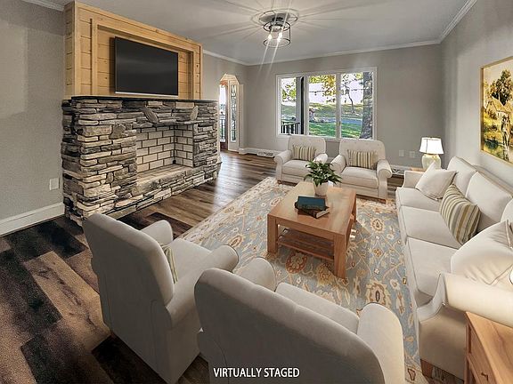 Stone fireplaceFamily roomPrivate bathPaver patioTile showerUpdated countersGas logs