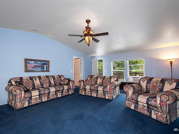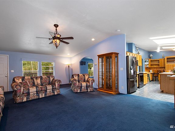 Home back on the market due to Buyer's failed sale of Buyer's home! Beautifully maintained Palm Harbor Home featuring a 1,084 SF detached garage/shop on a secluded acre! A private retreat boasting 1,624 SF, 2 possibly 3 bdrm (3 bdrm septic), 2 full bthrm, open concept living w/vaulted ceiling, frml living rm w/FP, dining rm w/skylight & slider to covered deck, lg kitchen w/oak cabinetry-island-eating bar-tile floor-skylight-built-in office, primary bdrm w/jetted tub-separate shower & walk-in closet, family room, utility rm w/washer-dryer-abundant strge, covered entry deck & newer roof. The manicured grounds offer privacy, flower gardens w/trellis', fenced area for pets, fire pit, abundant parking, garden space & RV parking.