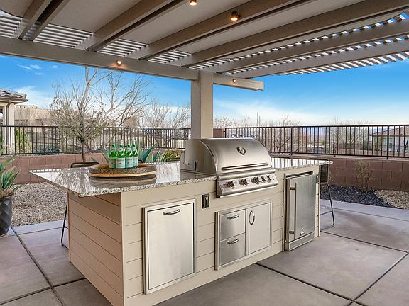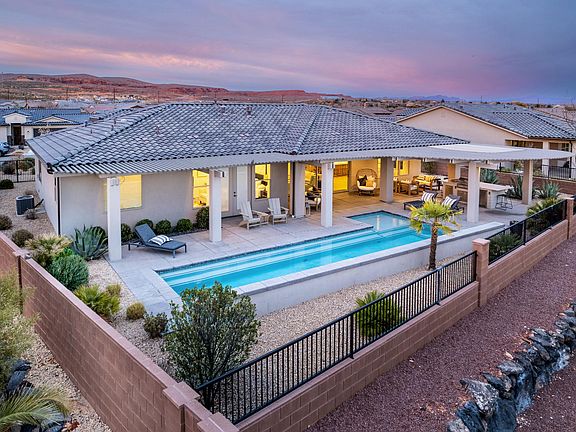 This 2019 Parade Home is packed with luxury upgrades and sold fully turnkey—including furnishings, bedding, towels, cookware, and more! Offering 3 bedrooms + office (or 4th bedroom), each is an ensuite with an attached bath (except the office). The gourmet kitchen features floor-to-ceiling cabinetry and two pantries. The great room boasts a fireplace and 16' sliding glass doors opening to the backyard. The primary suite has French doors to the pool, a spa-like bath with dual shower heads, and floating euro cabinets. Outside, enjoy a huge outdoor kitchen, pergola, and private pool. Additional features: 3-car epoxy garage, soft water system, whole-home audio, Matisse Smoked Wood flooring, and fire table. Beyond the home, Brio offers resort amenities that embody the St. George lifestyle.