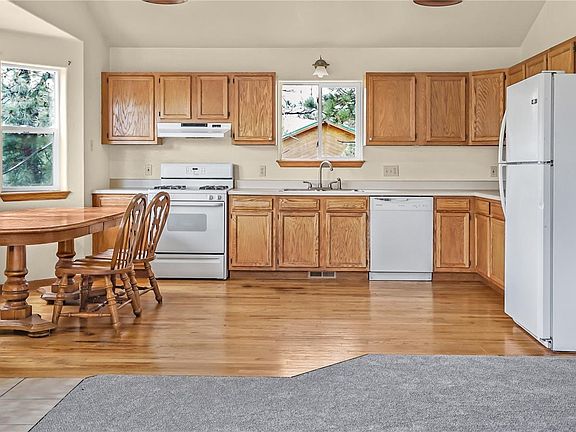Step inside to an open-concept main level with vaulted ceilings, gleaming hardwood floors, and a bright bay window that fills the living and kitchen areas with natural light. The well-designed layout includes two inviting bedrooms, a full bath, and thoughtful details such as pendant lighting, new carpet, and a lighted ceiling fan.