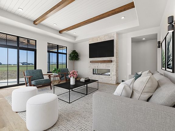 Stoned fireplaceWood beamsEpoxy floorsAccent wallsCovered porchQuartz countertopsQuartz backsplashes