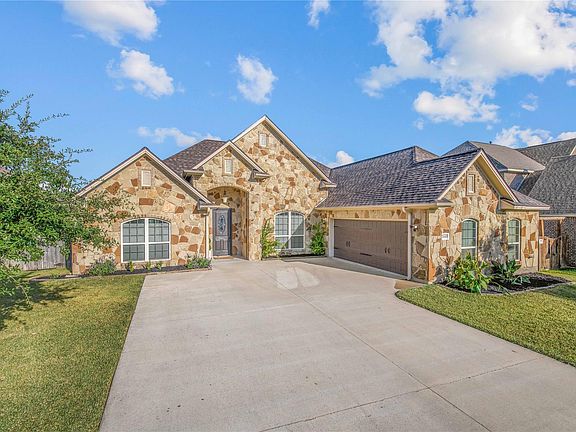 Welcome to this stunning stone-exterior home on a quiet cul-de-sac in Castlegate II. Step inside to a soaring entryway leading to a formal dining room with an elegant coffered ceiling. The spacious living room boasts high ceilings, crown molding, and a striking floor-to-ceiling limestone fireplace. The kitchen is a chef’s dream, featuring granite countertops, a stylish stone backsplash, eating bar, and butler’s pantry. Beautifully stained wooden cabinetry complements the breakfast area with a charming chandelier and built-in coffee bar. The large primary suite offers a tray ceiling with cove lighting and opens to a luxurious bath with separate vanities, generous counters, a corner soaking tub, and large walk-in shower. One guest bedroom has an en-suite bath with walk-in shower, while two others share an oversized bath with dual sinks and ample space. Enjoy outdoor living on the large covered patio with built-in grill and sink—perfect for entertaining!