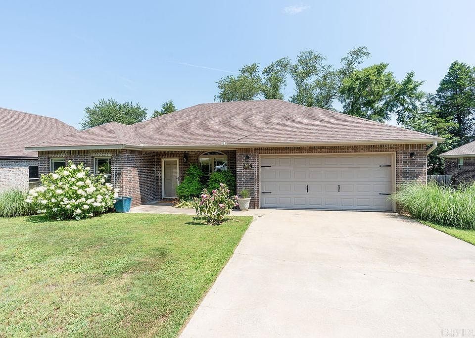 This charming 3-bed, 2-bath brick home in Ridgewood S/D features a stylish kitchen with granite countertops and stainless appliances. Warmth and welcoming describe the open living, dining, and kitchen floor plan, complemented by a split layout separating the master from two spare bedrooms. Wood and tile floors grace the interior, with granite in the kitchen and bathrooms. The master bath includes a jacuzzi tub, shower, and a walk-in closet. A recent 50 gal water heater installation ensures ample hot water. The double garage provides extra storage, while a backyard deck overlooks a firepit for cozy evenings. Close to Harps grocery and Westside Elementary, this home suits both starters and empty nesters seeking simplicity. Don't miss out—schedule a tour today!
