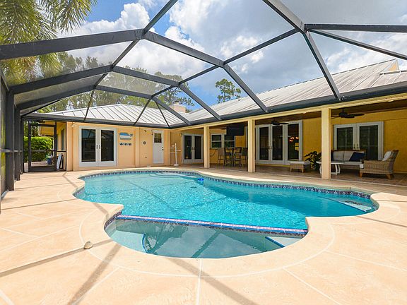 The magic begins as you drive through the gate and feel the unique calm the community provides with required 1/2 acre lots. Opening the front door of this home surprises you with high ceilings, open floor plan and views out to the heated pool, spa and lush backyard. The kitchen offers granite, stainless steel appliances and ample room. The attached great room with fireplace is a great focal point and leads to the other three bedrooms and bath, which can be closed off. The third bathroom/laundry room is conveniently located off the drop-zone, running between the garage and the kitchen. Park your toys in the community lot for only $100 a year. This CBS home is also protected from the elements with a metal roof, and impact windows and sliders. Easy access to highways, beaches, golf courses, boating, fishing, airports, restaurants and more. Take a look and make it your home. There is also an invisable fence around the property.