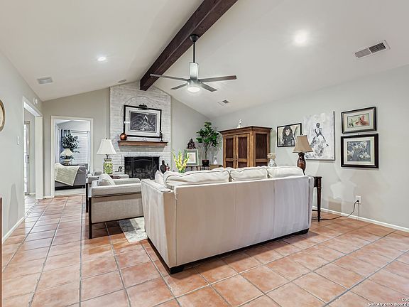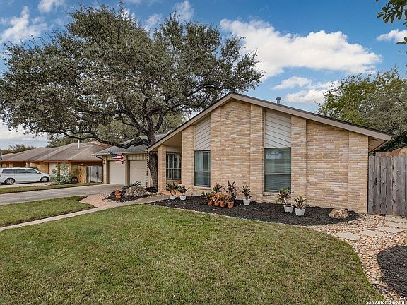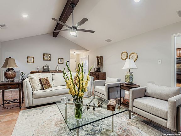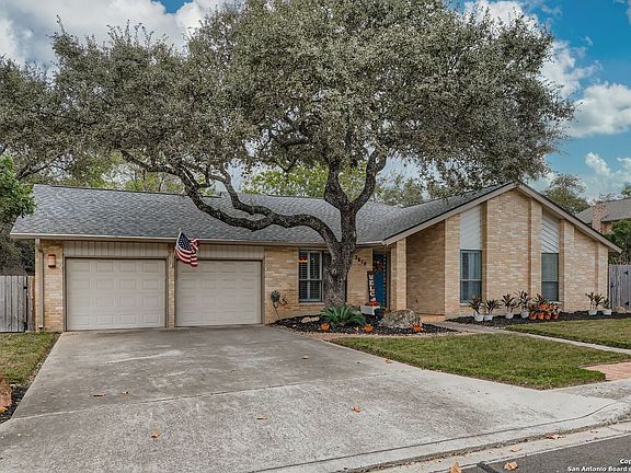 This single story Oak Hollow Estates residence is uniquely warm and elegant. It is superbly designed for both relaxation and entertaining. The moment you step inside, cathedral ceilings, stylish Saltillo tile and a grand fireplace establish the welcoming ambiance of the main living area - a space generous enough to accommodate gatherings with family or friends, yet intimate enough for quiet evenings. The kitchen is eye-catching with thoughtful functionality. Granite countertops provide a generous workspace that supports the gas-powered range and double ovens that most home cooks prefer. A breakfast nook with custom built-ins offers a place for everyday feel-good dining and morning coffee experiences as its oversized glass door windows overlook the tree lined yard. A separate dining room with plantation shutters provides distinct space for more formal gatherings. The three bedrooms include a primary suite that commands attention with its size and comfort and the primary bathroom sports large dual walk-in closets, an ultra- spacious shower, and dual vanities to create a personal retreat within the home. The family room is a perfect setting to enjoy movies or gaming - it is spacious and cozy with high ceilings and plenty of natural light. The outside property is an impressive asset, as it is beautiful, private, and large. The wide, tree lined backyard is secured by a privacy fence and transforms into a genuine extension of the home. A covered patio flows into an extended deck and flagstone area, creating distinct areas for different activities - whether you're grilling, lounging, or simply watching the Texas sky. An irrigation system keeps landscaping maintained without demanding your constant attention. The home sits within the NEISD school district, positioning you near quality educational options. At approximately 2,193 square feet, this layout balances spacious living with manageable maintenance, offering room for your life to unfold without excess.