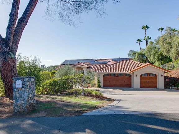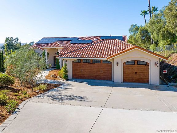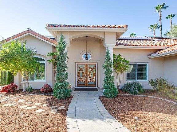 Own this stunning single-level Mediterranean home on 1.2 acres at the end of a tranquil cul-de-sac. Elevated on a hill, it offers breathtaking sunset views and beautifully landscaped grounds. The expansive open floor plan features high ceilings and large windows that flood the space with natural light. The gourmet kitchen flows seamlessly into the inviting living area, perfect for entertaining. Enjoy your own private vineyard, enhancing the charm and appeal for wine enthusiasts. With a covered patio that includes a stone fire pit and fountain, this exquisite retreat embraces elegance and tranquility, blending indoor and outdoor living effortlessly. Recent upgrades, including new luxury vinyl wood flooring, high end window coverings, solar panels (owned not leased), and fresh paint in 2022. Enjoy a large 3 car garage with a bonus room and RV parking via rear gate access. Conveniently located near Kit Carson Park, the 15 Freeway, and Westfield Mall, this property has no HOA or Mello-Roos fees. Experience the beauty and luxury of this exceptional home today!