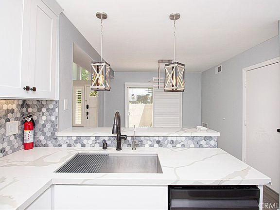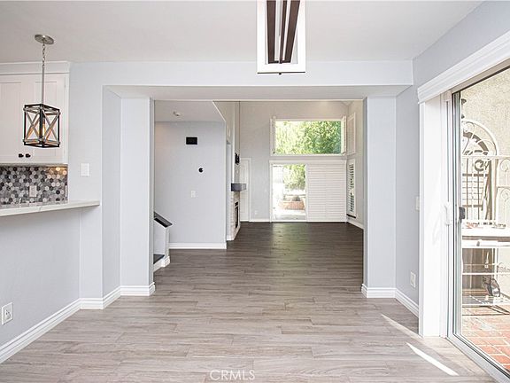 Discover this beautifully upgraded townhouse in the sought-after Arbor Park gated community! Boasting nearly 1,600 square feet of meticulously updated living space, this home offers two master suites (one conveniently located on the main floor), 2.5 bathrooms, and a versatile office that can easily serve as a third bedroom. The remodeled kitchen is a chef's dream with stainless steel appliances, granite countertops, a tile backsplash, a breakfast bar, and plenty of storage in sleek white cabinets. The open layout seamlessly connects the kitchen, dining area, and cozy living room, which features a stone fireplace, high ceilings, and large windows that flood the space with natural light. This home is packed with stylish upgrades: enjoy vinyl flooring throughout (no carpet!), recessed lighting, ceiling fans, wood shutters, and a spacious private patio for outdoor relaxation. The main floor master suite offers a ceiling fan, high ceilings, patio access, and a luxurious en-suite bath with a barn door leading to a walk-in closet complete with custom shelving. The upgraded bathroom features a tiled walk-in shower with dual shower heads, a glass door, a bench, and a modern vanity with upgraded light fixtures. Upstairs, you'll find the second master bedroom with a private balcony, mirrored wardrobes, a ceiling fan, and an en-suite bath featuring dual sinks and an upgraded vanity. The additional room can serve as an office or third bedroom, equipped with wood shutters and recessed lighting. The two-car attached garage provides additional storage and houses the laundry area. Residents of Arbor Park enjoy access to community amenities, including a sparkling pool and spa. This prime location is close to shopping, parks, the Valencia Mall, the Farmers Market, schools, and the freeway. This townhouse perfectly blends comfort, style, and convenience—don’t miss out on this exceptional opportunity!