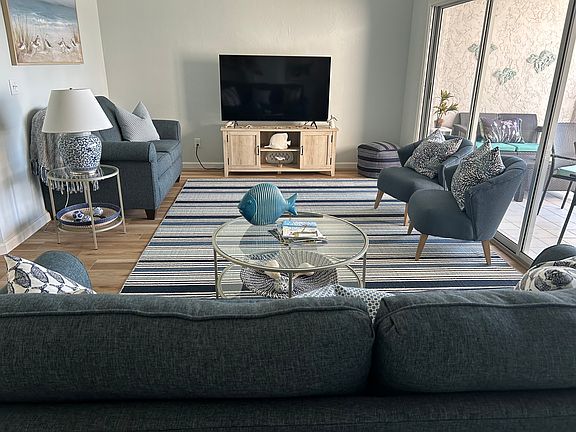 Beautiful lake views from this just renovated open and bright condo. Second floor affords high ceilings and privacy. All new luxury vinyl flooring and freshly painted creating a great flow. Large master with TV and updated bath features lake views. Guest room with TV and 3rd bedroom. Attached garage along with parking and 10 minutes to Beach. Perfect location close to all of your shopping and dining needs. Pools, tennis courts and a gym on site. Decorative and appealing in every way!
