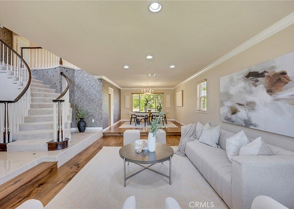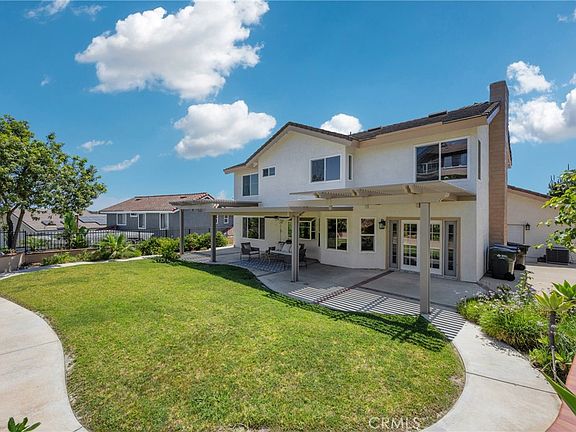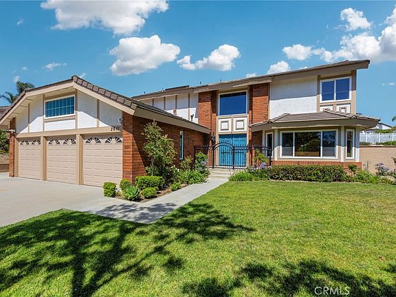 Nestled at the most desirable neighborhood in Rowland Heights, on the higher ground with a mountain view, this well maintained, turkey, single family residence is a must see. As you entered the front door, you are immediately greeted with a glamourous chandelier and a grand staircase, accentuating the enormous vaulted ceiling. The property offers 4 bedroom, 2.5 bathrooms surrounded with imported textured-wallpapers and an open floor plan with lots of space that is perfect for families. The kitchen has a black granite counter top and a tiled backsplash for easy cleaning, adding stainless steel appliances for the modern looks. Upstairs, a French door leads to a stunning master suite, boasting cathedral ceiling, recessed lighting, designer textured wallpaper and a bright master bath with a large attached tub, a standing shower, double vanities, make-up area and a walk-in closet. 3 more generous sized bedrooms are down the hallway with another double sink, full bathroom for convenience. 3 car garage with a long drive way provides plenty of space for storages or guest parking. The indoor laundry is at the main level across from the powder room offers multiple cabinets and a possibility to install a sink. A newly installed wood-liked aluminum patio awaits as you walk out to the backyard. The extensive patio length covers wall to wall with the middle part being completely covered and a ceiling fan, and the 2 lattice styled sides allowing natural lights to come through. The entire landscape is beautifully cured with variety of fruit trees. Other upgrades include updated piping with PEX material, brand new carpet, newer exterior paint, water heater, AC and furnace for the utmost comfort. The property not only captivates functional living but also presents possibilities. This home seamlessly blends upscale and sophistication, creating a captivating retreat in the heart of Rowland Heights.
