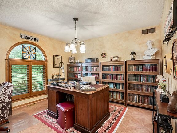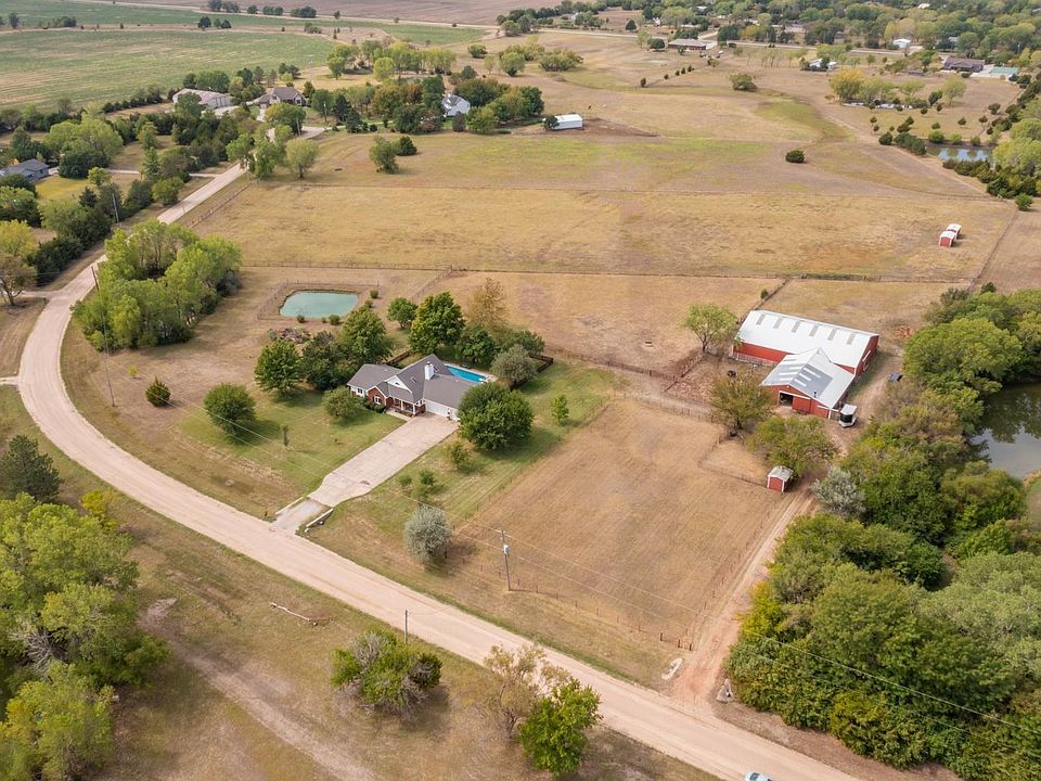 Price Reduced! Horseman's paradise on almost 10 acres, located within walking distance of Goddard, Kansas. It has everything you could ever want: home, barn, pool, and pond. Check out this pristine home and acreage that provides a country feel while being within minutes of the amenities of the city. This airy, light-filled home features 4 bedrooms and 3.5 baths, a 3-car garage, a wood burning fireplace, a wet bar, and several spacious living areas. The home is all electric, and there are two water wells: one for household use and one for the in-ground, self-draining sprinkler system. The roof, deck, siding, and many windows were replaced in 2011, and the energy-efficient geo-thermal heat pump was installed in 2017. The beautiful backyard pool has an automatic pool cover, and the pool liner and sand filter were replaced in 2022. The pond has a dock, and the fishing is good. The insulated horse barn has 4 stalls, including a foaling stall (all with Equiterr flooring), a wash rack room, tack/feed room, and storage for all your toys. Hay storage is provided in the attached 10x40 hay room, and weather is no problem with the attached 60x80 indoor arena with an automatic mist system to keep down the dust. There are 4 pastures, all with horse-safe fencing (pipe or barbless barb wire), a sand catch pen, and 3 loafing sheds.