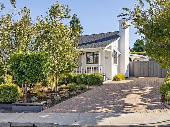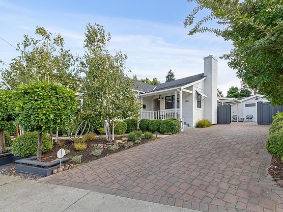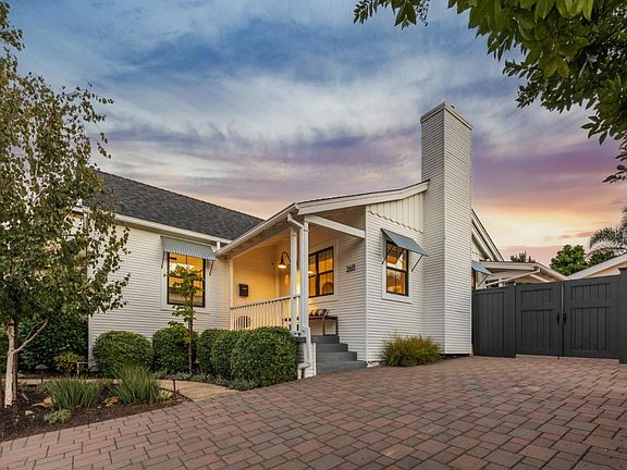 Charm begins at the curb with a thoughtfully composed landscape, inviting farmhouse porch, corrugated metal awnings and a paver driveway with gated privacy fence offering a glimpse of the cottage beyond.