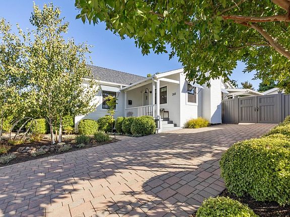 The all-white Farmhouse interior is brought to life by natural-toned hardwood floors and Moroccan floor tile with bold, geometric flair. Recessed lighting illuminates living spaces, which include a fireside living room with barn door to private bedrooms, a well-conceived kitchen with a classic farmhouse sink and suite of stainless steel appliances, and a dining area with double French doors to a backyard garden oasis, complete with a patio, fireplace, cedar hot tub, raised garden beds, DG lounging platform and a charming studio cottage with an open beam ceiling and full bath, providing versatile options for modern living.